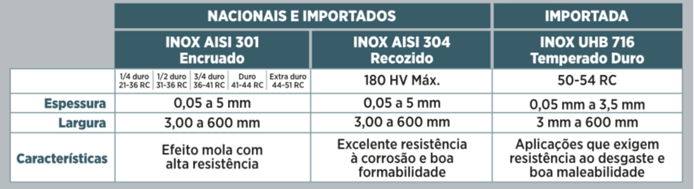 Trabalhamos com Inox AISI 301, 304 e UHB 716 e Alto Carbono SAE 1070 e 1095 em cortes sob medida.